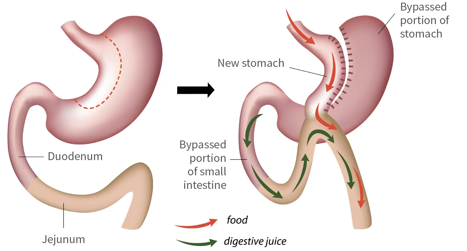 • Bypassing a section of the small intestine, so food travels directly from the pouch into the intestine further down.